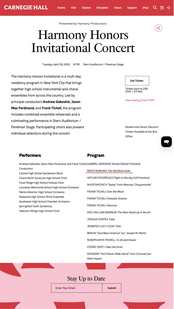 I am honored to share that my composition, “The Red Book” Suite, will be performed at Carnegie Hall’s Stern Auditorium / Perelman Stage in New York on Tuesday, April 28, 2026, at 8:00 PM.
